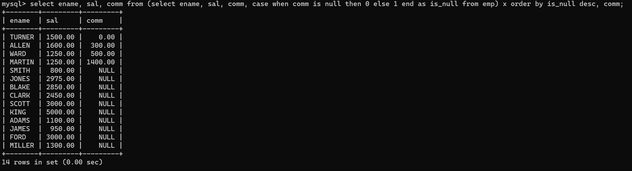 slect ename, sal, comm, case when comm is null then 0 else 1 end