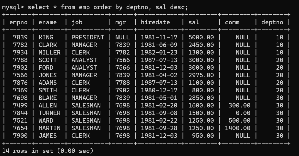 - order by절에 여러 조건을 넣음으로써 순차적으로 정렬순서를 입력할 수도 있다.