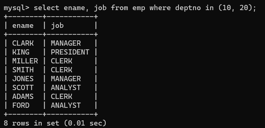 - where절에 column in (condition,1, condition2) 와 같이 여러 값을 조건으로 넣을 경우, in안에 값 중 하나에 해당하면 True로 인식한다.