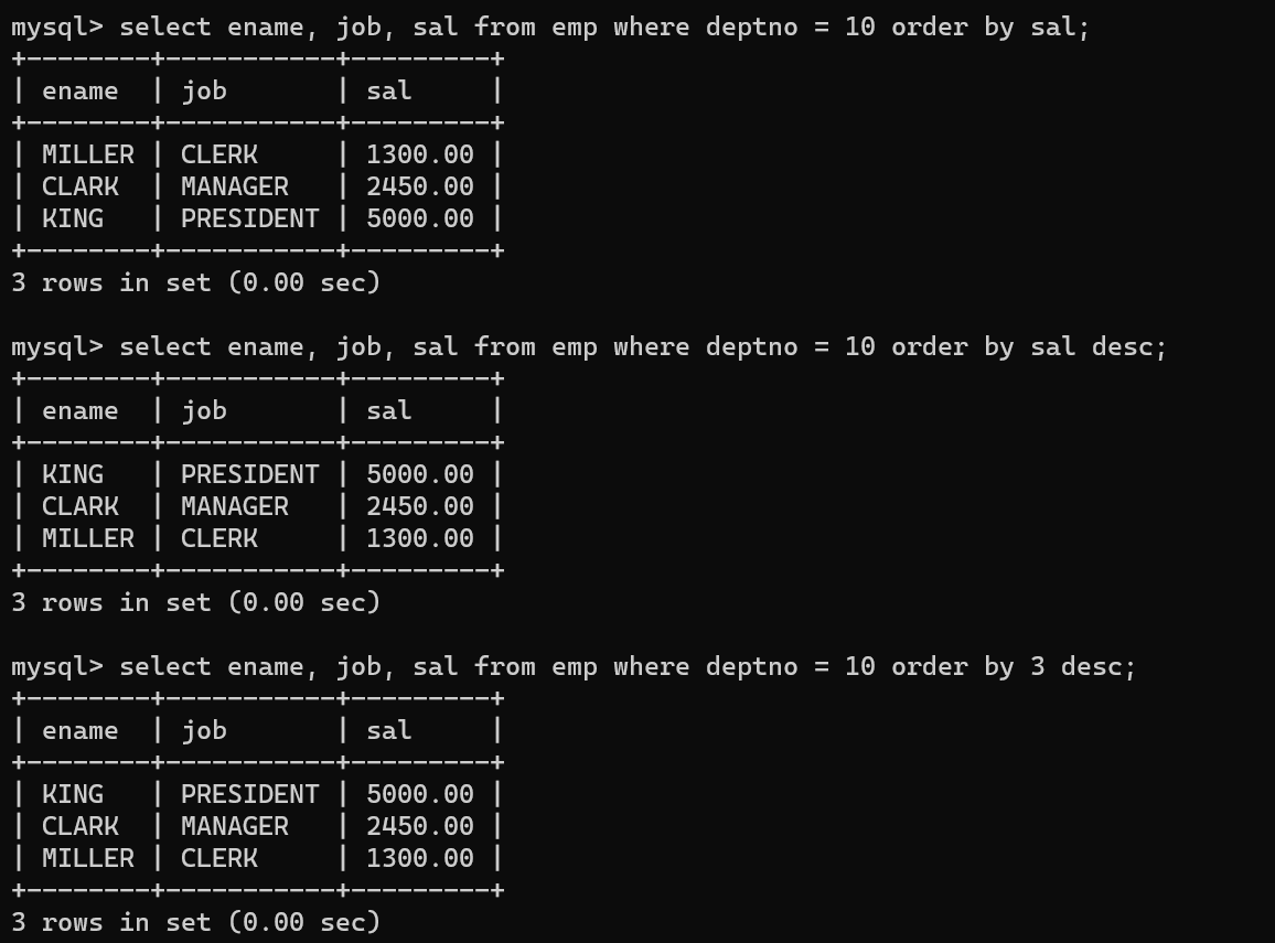- order by절에 컬럼을 넣거나 select에 넣은 값을 왼쪽부터 1,2,3,으로 생각하고 번호를 통해 정렬할 수도 있다.