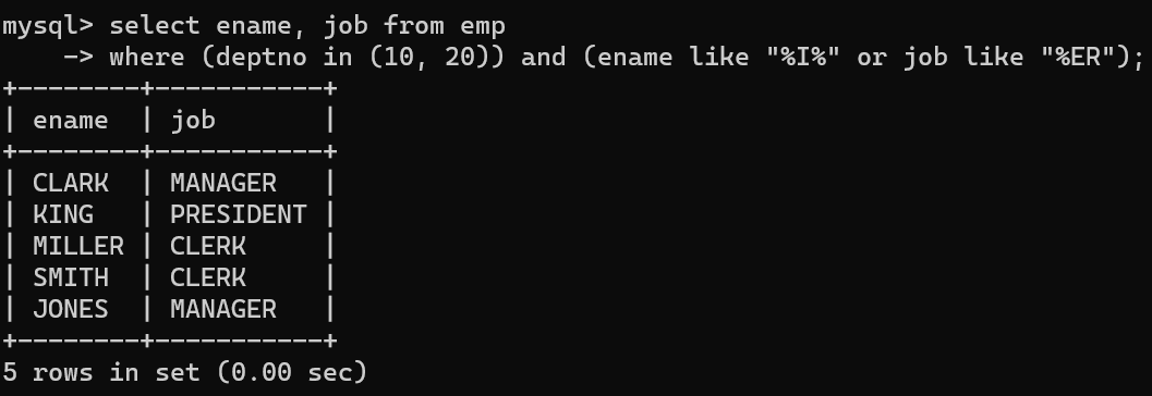 - 또한, and로 다중 조건을 넣을 수 있으며, like는 여러 문법 기호를 통해 다양한 조건을 유동적으로 사용할 수 있다.