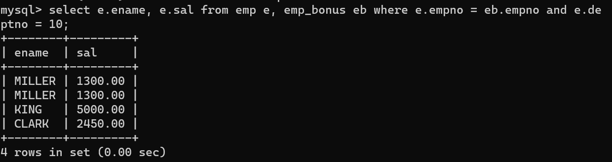- 둘 중 위의 코드 같은 경우 emp table에서 조건에 충족하는 3개의 레코드가 dept 레코드 4개에 각자 곱해서 결과가 출력되 3∗4=12라는 결과가 출력됐다.