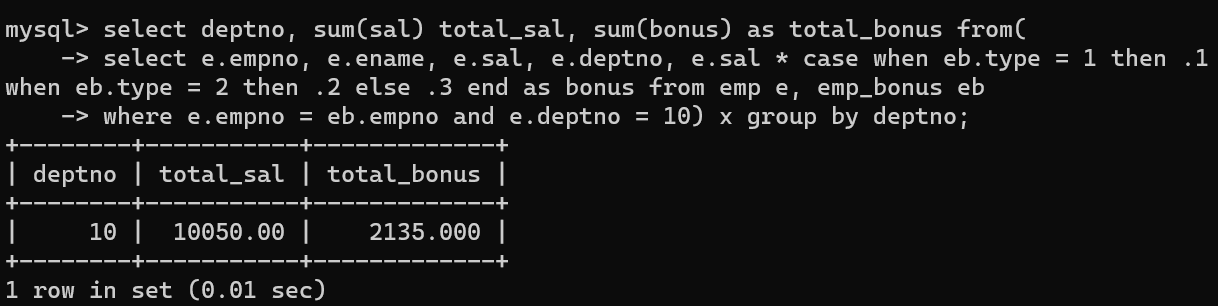 - emp_bonus라는 만들고, emp 테이블과 집계와 조인의 기능을 수행했다.