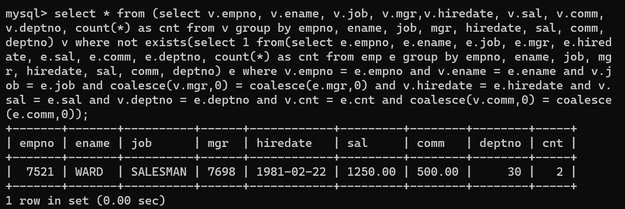 - 두 개의 테이블은 union all로 병합 시 두 테이블에서 중복되지 않은 값을 출력하면 중복되는 값을 확인 할 수 있고, 만약 출력되는 값이 없다면 두 테이블의 자료가 동일하다 것을 알 수 있다.