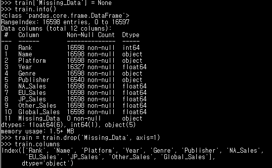 info() 함수의 결과를 보면 변수별로 non-null count가 나오는데 이를 통해서도 알 수 있다train['Year'].isna().sum()train['Missing_Data'] = None # Missing_Data 컬럼을 추가하고 NaN값으로 채워줌