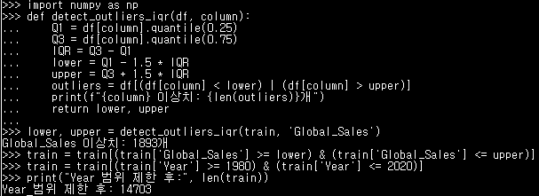 print(f"{column} 이상치: {len(outliers)}개")