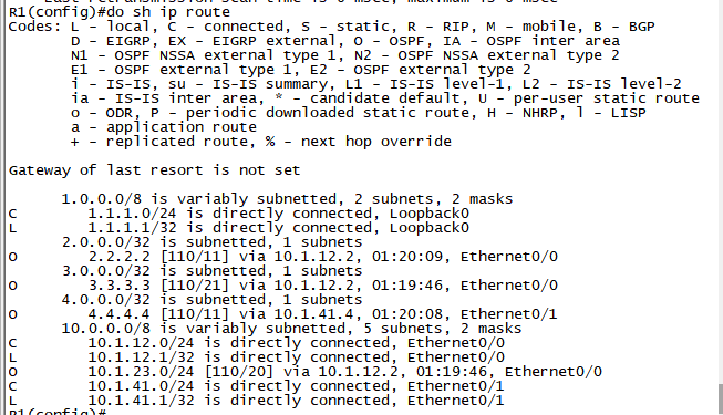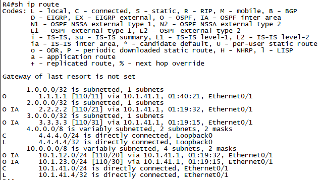 확인3. R4#show ip route로 경로를 확인합니다. (O, O IA 경로 모두 보임)