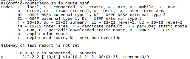 확인3. R1에서 show ip route ospf로 2.2.2.0/24 경로를 확인합니다.