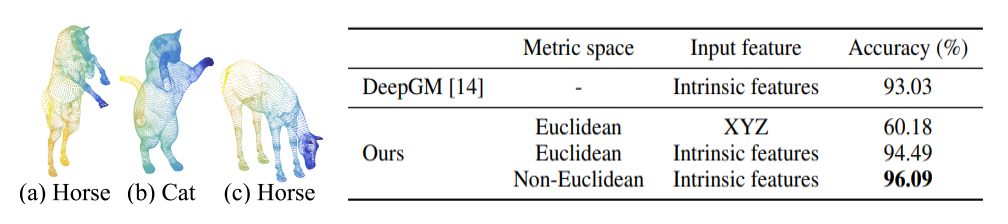 Non-Euclidean space 에 대해 일반성을 보여준다. (a) 와 (c) 는 같은 객체이지만 다른 행동을 하고있다 그렇다더라고 같은 객체이기에 맞춰야되는데 이러한 task에서도 높은 정확성을 나타내는것을 보여주고 있다.
