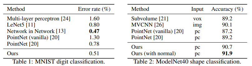 이 연구에서는 저자들이 2D 및 3D 유클리드 공간에서의 포인트 클라우드 분류를 평가하기 위해 MNIST와 ModelNet40 데이터셋을 사용했다. MNIST는 512개의 포인트, ModelNet40은 1024개의 pointcloud로 변환했다. ModelNet40은 표면 법선을 활용하여 포인트 수를 증가(5000개)시켜 성능을 향상시켰고, normal 정보를 넣어주니 더욱 성능이 올라감을 확일할수 있다.