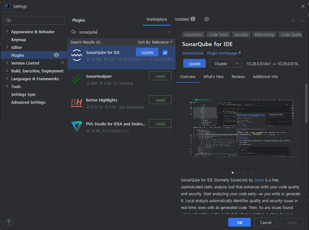 Sonarqube for ide 플러그인이 뜨는데 저걸 다운받아서 설치하면 된다.