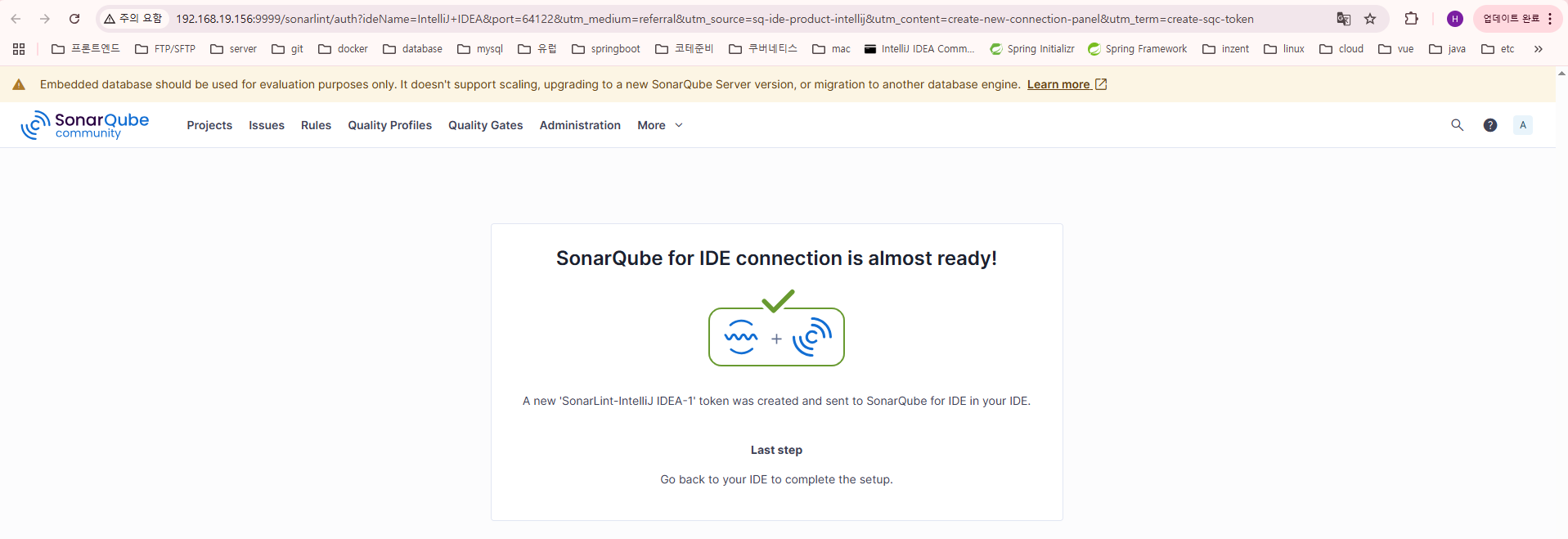 컨테이너로 띄운 소나큐브랑 인텔리제이랑 연결해서 token을 생성하는 작업이 이루어진다.