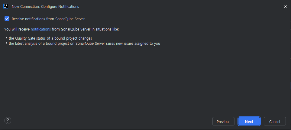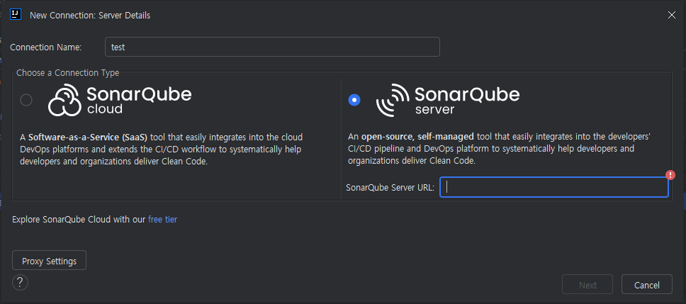 여기에 소나큐브를 구분할 수 있는 이름과 소나큐브 주소를 입력하고 next를 클릭하면