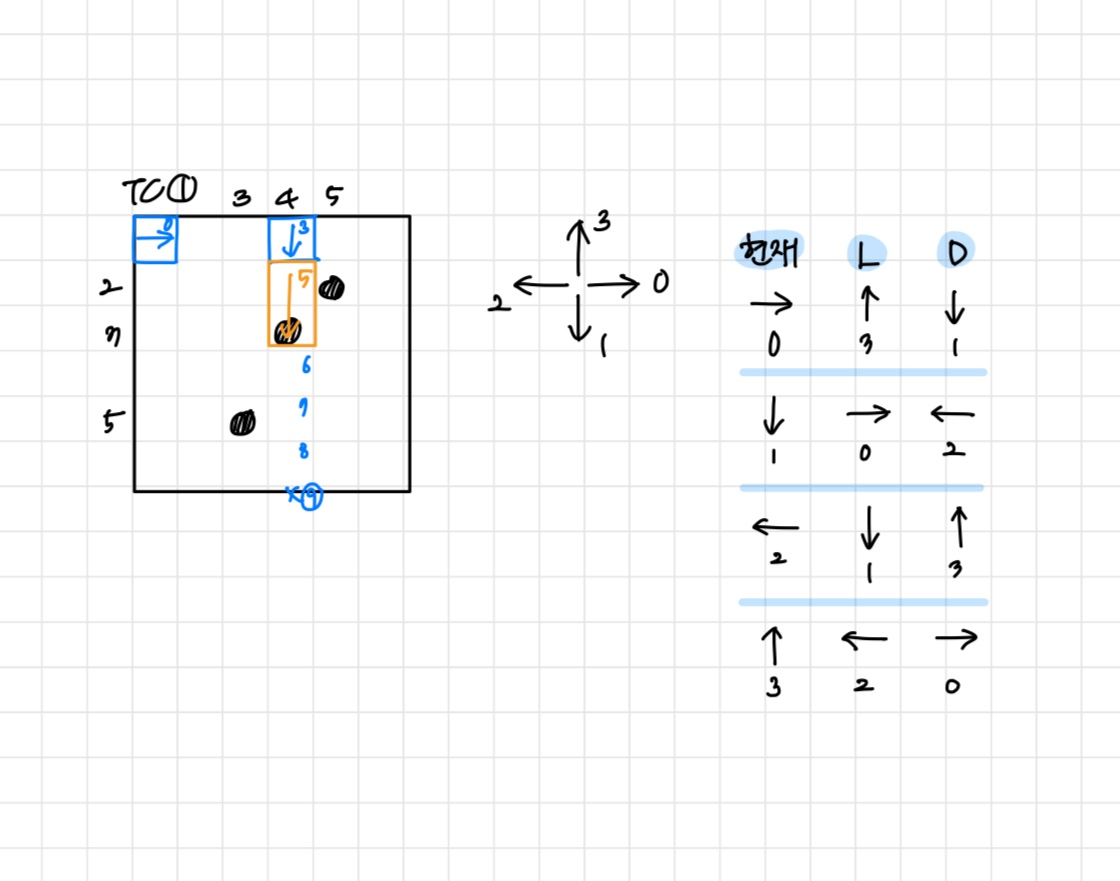 방향을 구현하기 위해서 동(0), 남(1), 서(2), 북(3)으로 나타내었고, 각각의 방향에서 왼쪽(L)과 오른쪽(D)으로 꺾는 것을 구현하기 위해 계산식을 썼다.