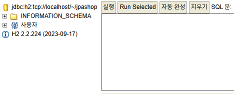 저는 jpashop이라는 데이터베이스를 새로 생성해서 접속했습니다.