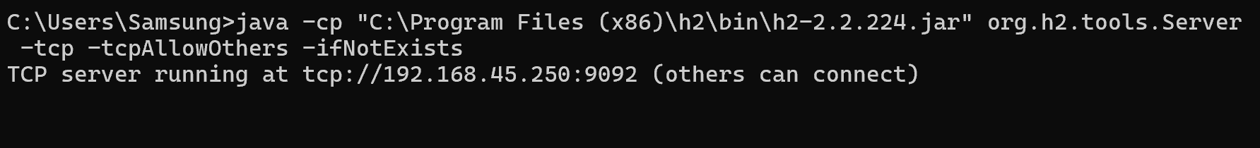 java -cp "C:\Program Files (x86)\h2\bin\h2-2.2.224.jar" org.h2.tools.Server -tcp -tcpAllowOthers -ifNotExists