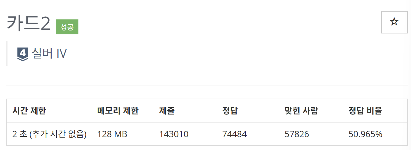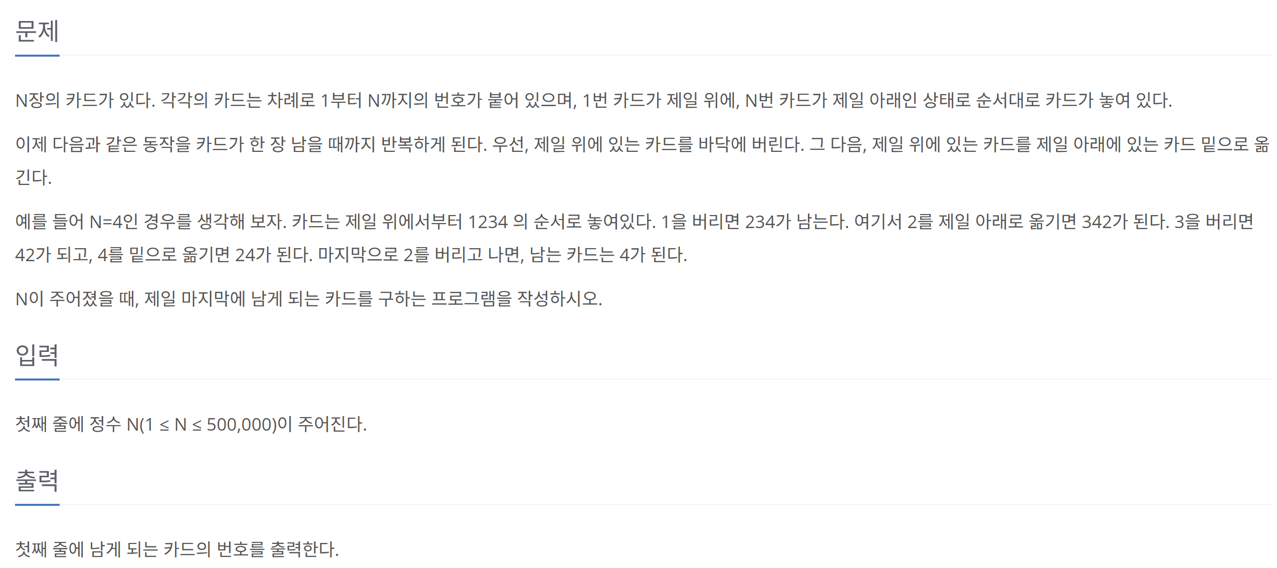 문제 문제 제목 문제 티어 문제 링크 2164 카드2 실버 4 https://www.acmicpc.net/problem/1244