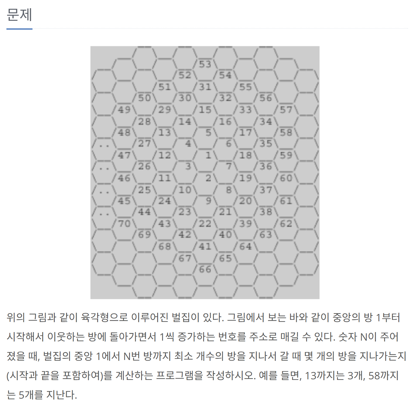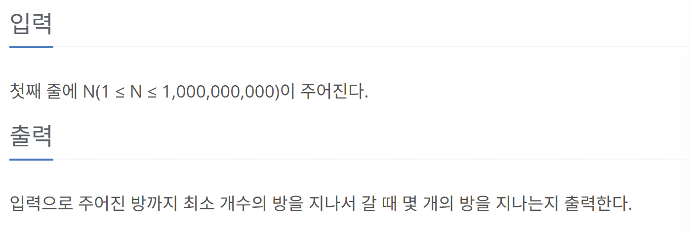 벌집은 위와 같은 규칙을 가지고 있다. 첫 번째 원에서는 1번 방만 있고, 두 번째 원에서는 2-7번 방, 세 번째 원에서는 8-19번째 방이 있다. 이렇게 1개, 6개, 12개, 18개, 24개...로 6의 배수의 개수로 방을 가진다. N이 속하는 n번째 원이라고 가정하면, 주어진 수 N번 방이 거치는 최소의 방의 개수는 n이다.