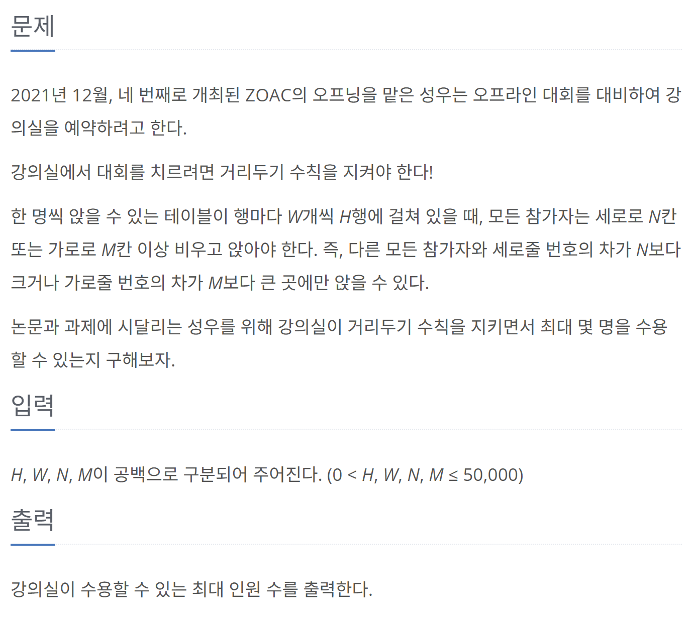 가로 / (띄워야 하는 간격+1)와 세로 / (띄워야 하는 간격+1)의 올림수가 앉을 수 있는 사람의 수이다. 나눈 값에서 올림을 하는 이유는 생각해보면 간단하다. 예를 들어, 가로 W가 10이고 세로 H도 10이라고 가정하자. 그리고 사람들마다 가로는 2칸씩(M), 세로는 3칸씩(N) 띄워야 한다면 최대한 앉을 수 있는 방법은 다음과 같다.