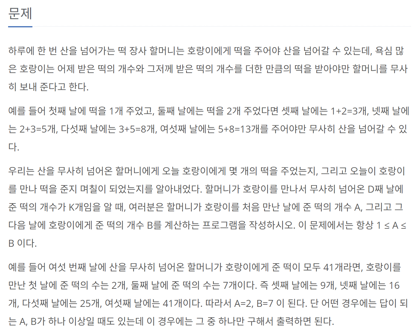 시간초과가 난 이유는 아마 매일의 떡 개수를 리스트에 append했기 때문인 것 같다. 우리는 마지막 날의 떡의 개수만 할머니가 말해준 떡의 개수와 일치하면 되므로 굳이 리스트에 전부 저장할 이유가 없다.