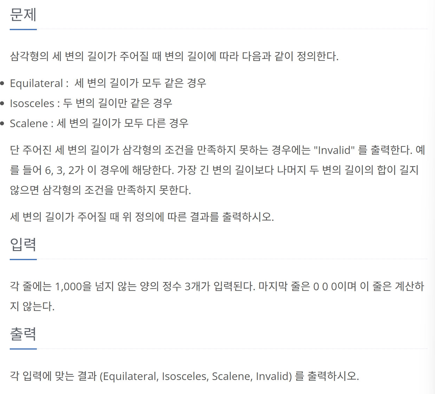입력받는 세 변의 길이가 모두 0인 경우에는 가장 큰 변의 길이도 0이다. 이 경우에는 계산하지 않는다고 주어졌으므로 break로 탈출한다.