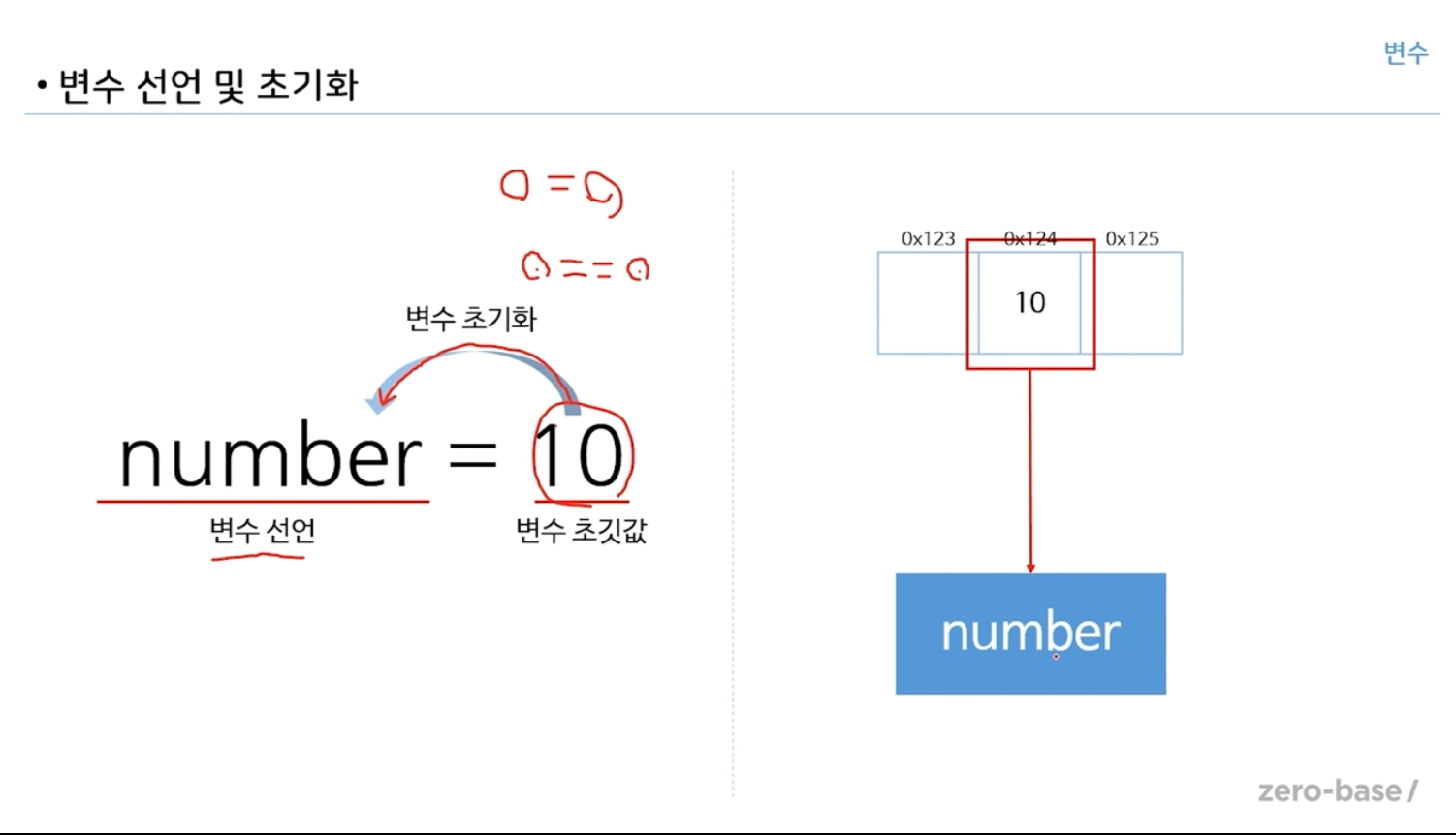 - 변수에 저장된 값은 변경이 이루어지기 전까지 계속 유지되는데, 변수를 사용하기 위해서는 변수 선언(ex:: num)과 동시에 초기화(ex:: =10)를 같이 해주어야함.