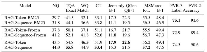 - RAG-Token-BM25 : BM25๋ก ๊ฒ์๋ ์ฌ๋ฌ ๋ฌธ์ ์ค์์ ํ ํฐ๋ง๋ค ๋ค๋ฅธ ๋ฌธ์๋ฅผ ์ฐธ์กฐํ๋ฉฐ ์์ฑํ๋ ๋ฐฉ์