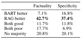 ์ฌ๋ ํ๊ฐ์์ BART๋ณด๋ค RAG์ ์ถ๋ ฅ์ด ๋ ์ฌ์ค์ (factual)์ด๊ณ ๊ตฌ์ฒด์ (specific)์ด๋ผ๋ ๊ฒฐ๊ณผ