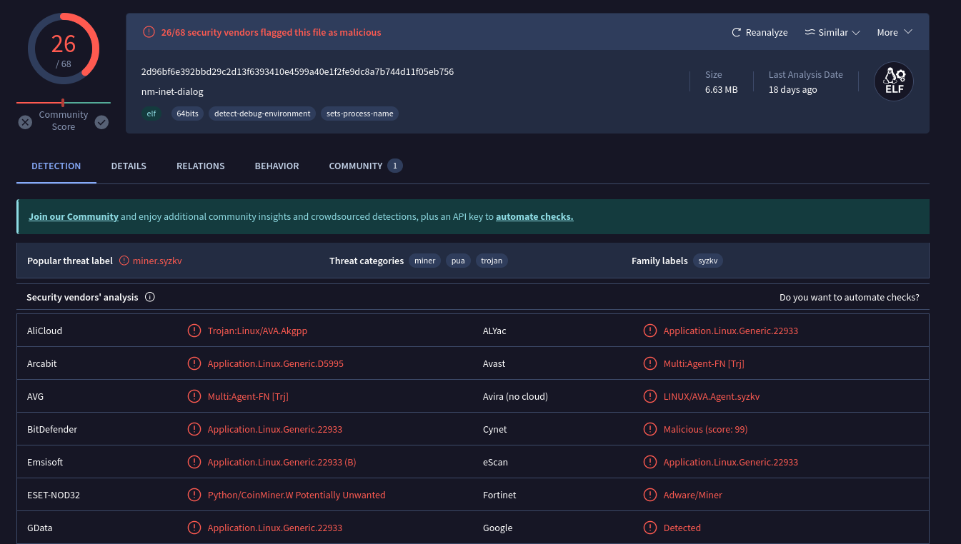 ExecStart를 보면 해당 service를 실행시킨 파일을 확인할 수 있고 우리는 그 파일을 다운받아 Virustotal에 유해성 검사를 해보려고 한다.