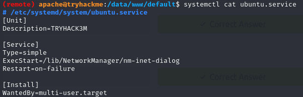 systemctl --type=service --state=running 명령어로 확인해보니 ubuntu.service의 Description이 TRYHACK3M 라고 되어 있다. 누가봐도 의심스러우니 더 자세히 확인해보자.