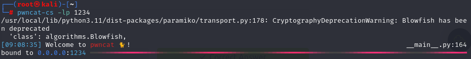 공격지에서 pwncat-cs로 1234번 포트를 열어놓은 모습이다.