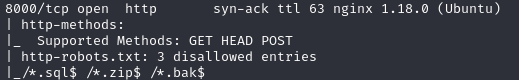 8000 포트의 robots.txt에서 sql, zip, bak 확장자를 가진 파일에 접근을 막고 있다.