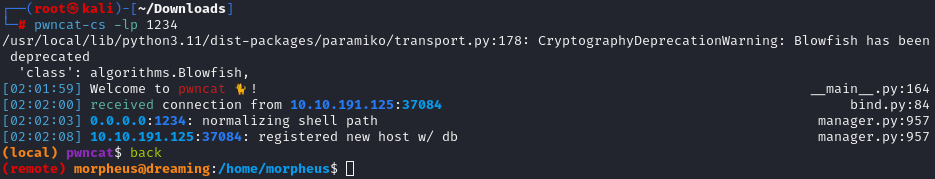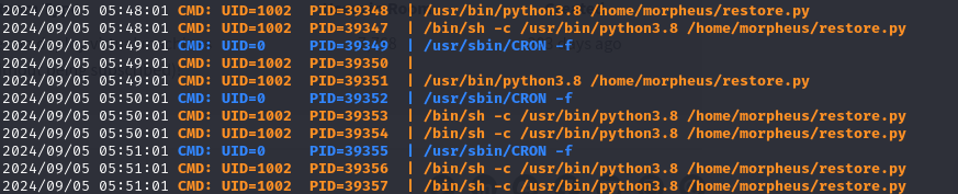 pspy를 통해 예약작업이 있는지 확인해보니 morpheus의 uid로 1분마다 restore.py가 실행되고 있었다.