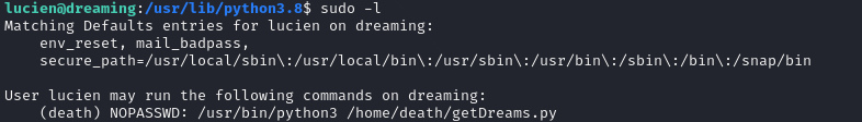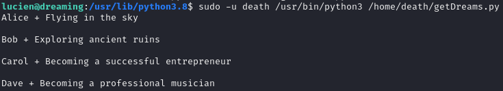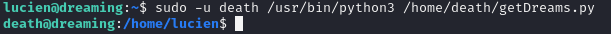 sudo -u death /usr/bin/python3 /home/death/getDreams.py