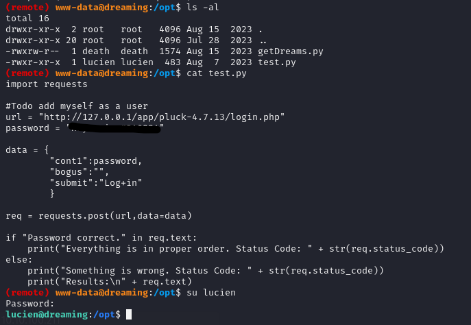 서버를 뒤져보던 중 /opt/test.py 코드에서 lucien 계정의 패스워드를 확인할 수 있었다.