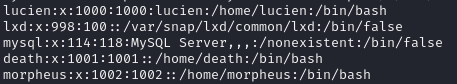 사용자 계정은 lucien, death, morpheus 3개가 있는 것을 확인했다.