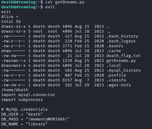 /home/death/getDreams.py 내용은 권한이 없어서 못보지만 아까 /opt 폴더에 똑같은 이름의 파일이 있는 것을 확인했었다.