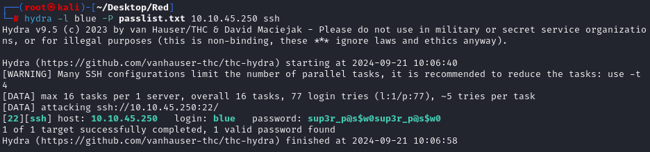 blue 계정으로 ssh 브루트포스 공격을 시도해보자.