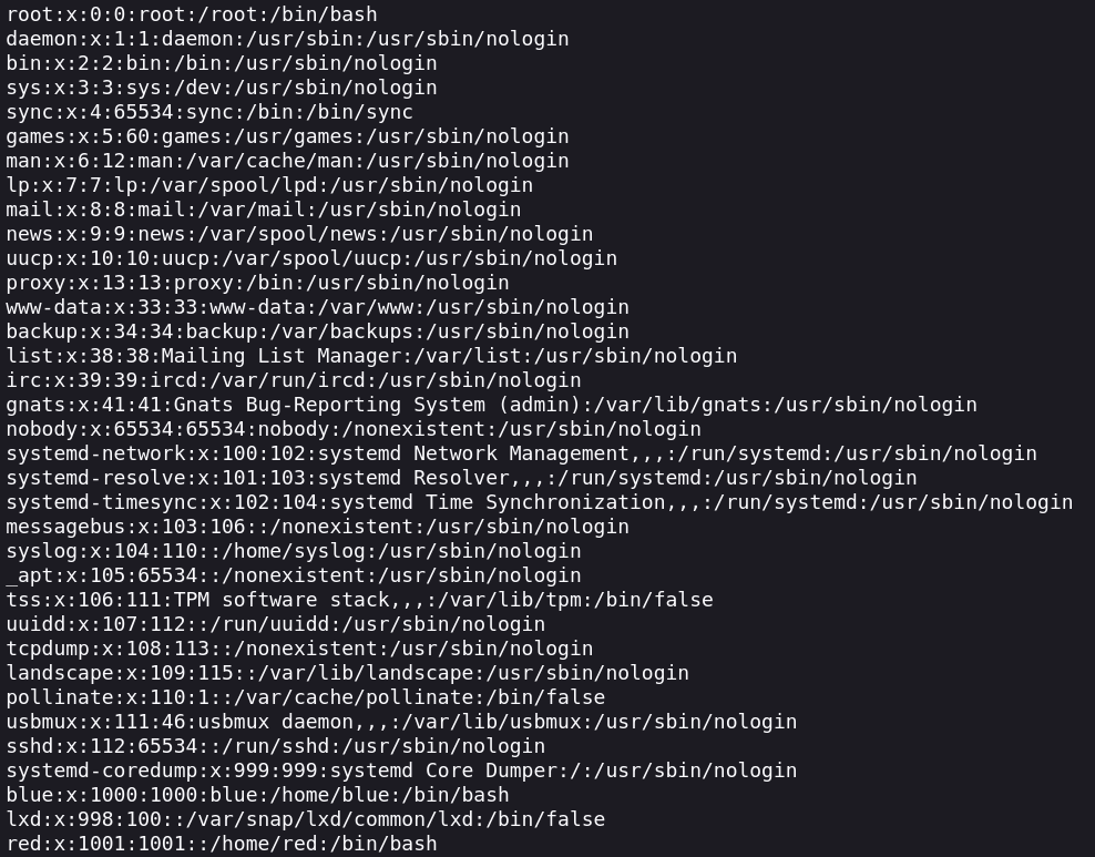 다시 돌아가서 passwd 파일을 보면 사용자 blue와 red를 확인할 수 있고