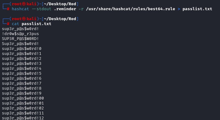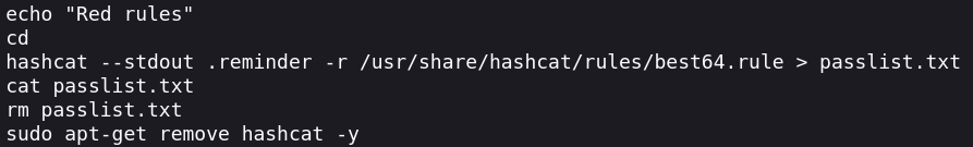 hashcat으로 .reminder 파일을 가지고 best64.rule을 적용하여 passlist 파일을 생성한 흔적이 남아있다.