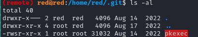 red 홈디렉토리에는 .git 폴더가 있고 안에는 setuid가 설정된 pkexec 바이너리가 있다.