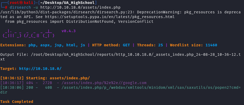 gobuster와 같이 디렉토리 버스팅을 수행하는 dirsearch로 index.php를 조사했더니 cmd 파라미터를 통해 명령어가 실행되는 것을 알 수 있다.