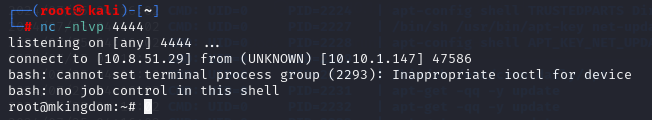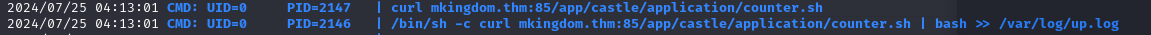 "mkingdom.thm"이라는 host에서 counter.sh를 다운받아 bash쉘로 실행한 결과를 /var/log/up.log에 저장하고 있다.