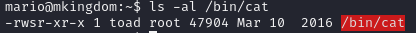 cat 명령어 파일의 소유자가 root가 아닌 toad로 되어있고 setuid가 설정돼있다.