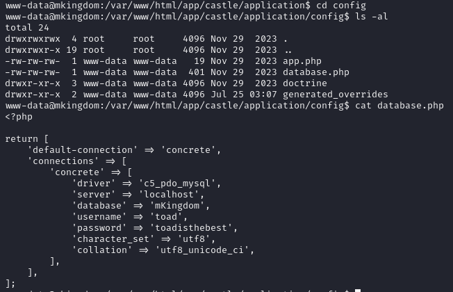 config로 들어가니 database.php라는 파일이 있었고 여기에 "toad" 라는 사용자의 계정정보가 들어있었다.