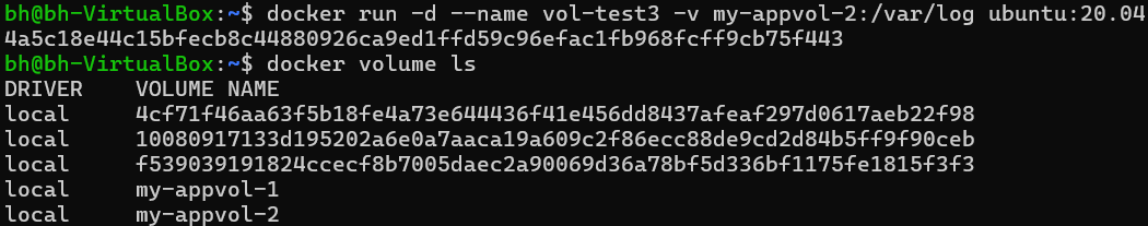 docker run --mount source=볼륨이름, target=연결할디렉토리 이미지이름docker run -d --name vol-test1 --mount source=my-appvol-1,target=/app ubuntu:20.04docker run -d --name vol-test2 -v my-appvol-1:/var/log ubuntu:20.04docker run -d --name vol-test3 -v my-appvol-2:/var/log ubuntu:20.04