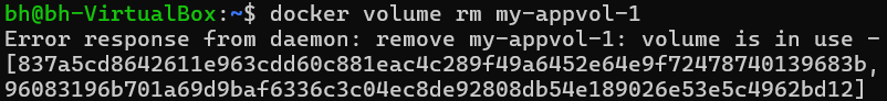 docker volume rm 볼륨이름docker volume rm my-appvol-1docker volume rm my-appvol-1 명령을 수행하면 연결된 컨테이너가 있다고 에러 메시지가 출력됨