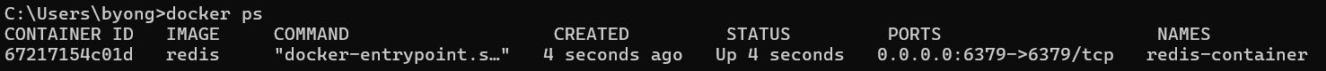 --name : 실행될 컨테이너의 이름 지정 (redis-container)-d : 컨테이너를 백그라운드에서 실행-p : 호스트와 컨테이너 간의 port 연결 (포트포워딩)redis-container 가 실행 되었는지 확인